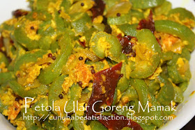 Snake gourd fried with mustard seeds, sliced dried chillies, onions, garlics some turmeric powder and eggs.. Indian menu for today.. I like to eat 'nasi mamak', basically like the taste of the rice...what I knew was the way they cooked the rice was they discard the starch during boiling and add some salt in it..(agaknya lah ni).. I can eat nasi mamak in ' a heap of small mountain' ..and finished it cleaned..but after that...you can just miss dinner without realising it..hehe